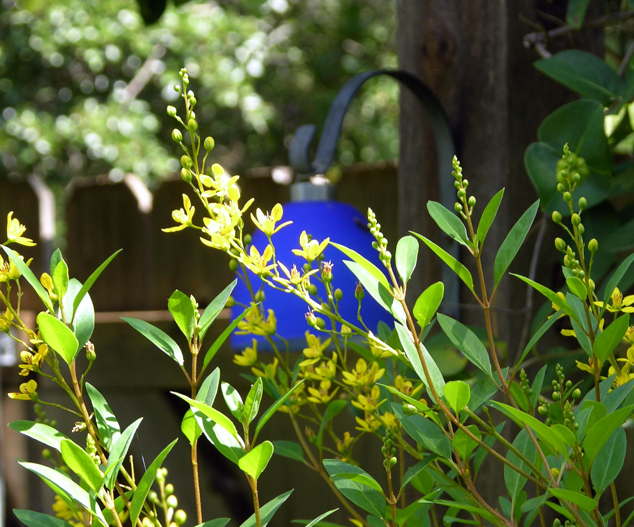 I can never, ever remember the name of this shrub. I’ve taken heaps of pictures of the label when I see it at ‘The Natural Gardener,’ but somehow, the name just doesn’t stick. The blue glass is a shade from the old kitchen light fixtures we had; I love this colour combination.