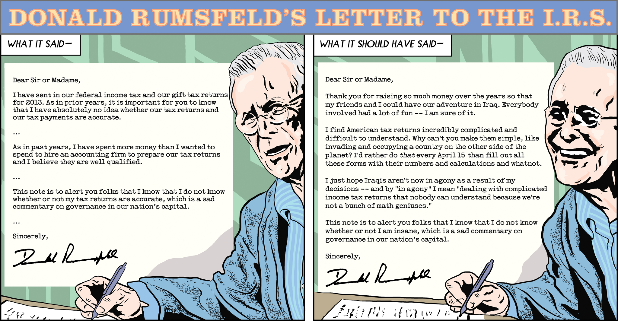 So this was in yesterday’s “See Something Say Something” section of the New York Times Review section.  I recently discovered that this anti-IRS rant is a yearly habit with Mr. Rumsfeld.  I found this version from Michael Kupperman and David Rees to be a gut-buster.
