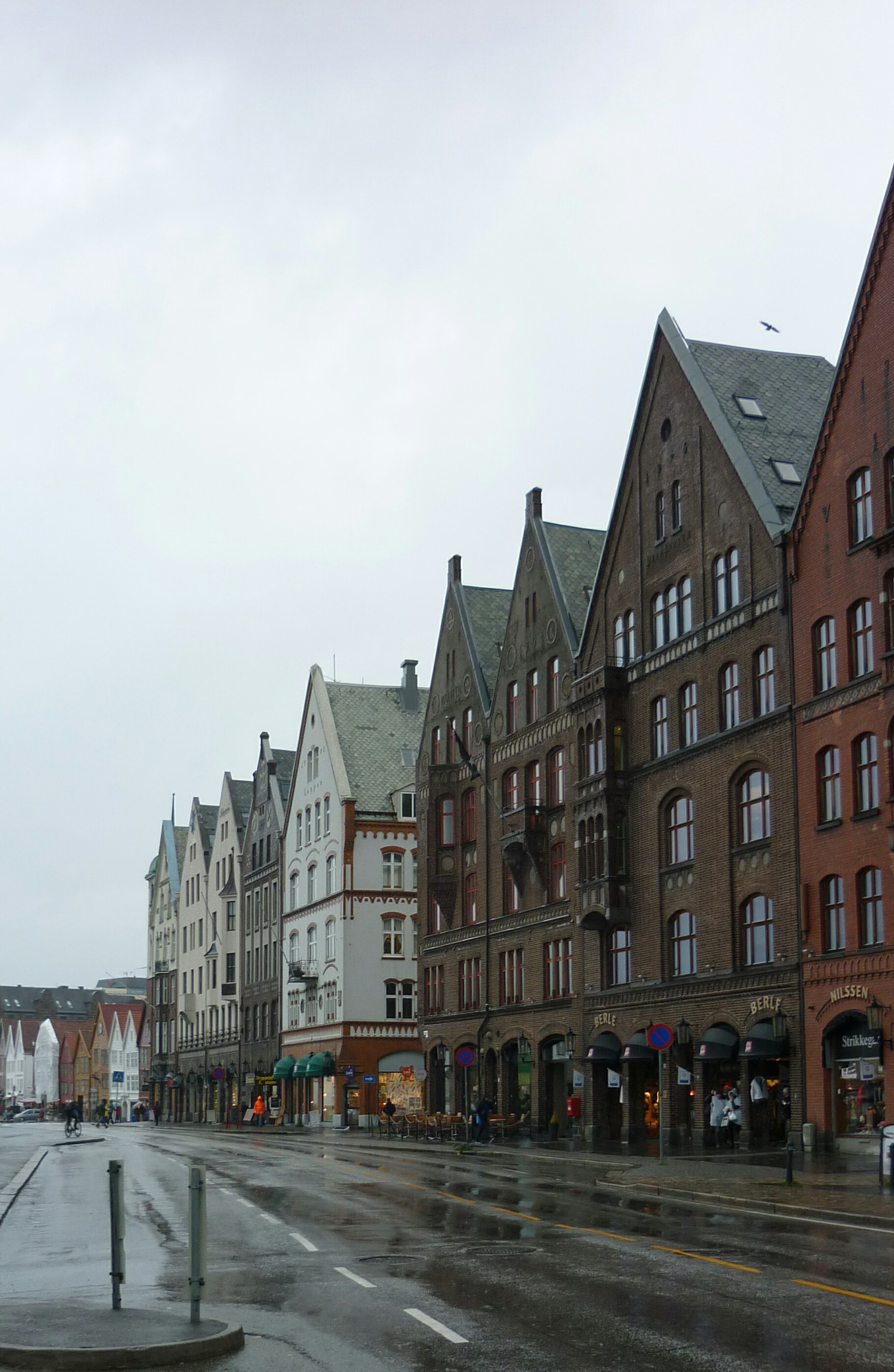 I did manage to get a couple photos of Bergen before I got drenched and wind-swept. This is our hotel, Det Hanseatiske Hotel, in an old Hanseatic trading post, the Finnegaarden, which dates back to 1403. The room has massive wood beams everywhere. It reminds me of my room in the 16th century farmhouse we lived in in Marlesford, Suffolk, England when I was in high school. (If you go to the hotel’s website, our room is the first one that shows – http://www.dethanseatiskehotel.no/en/)