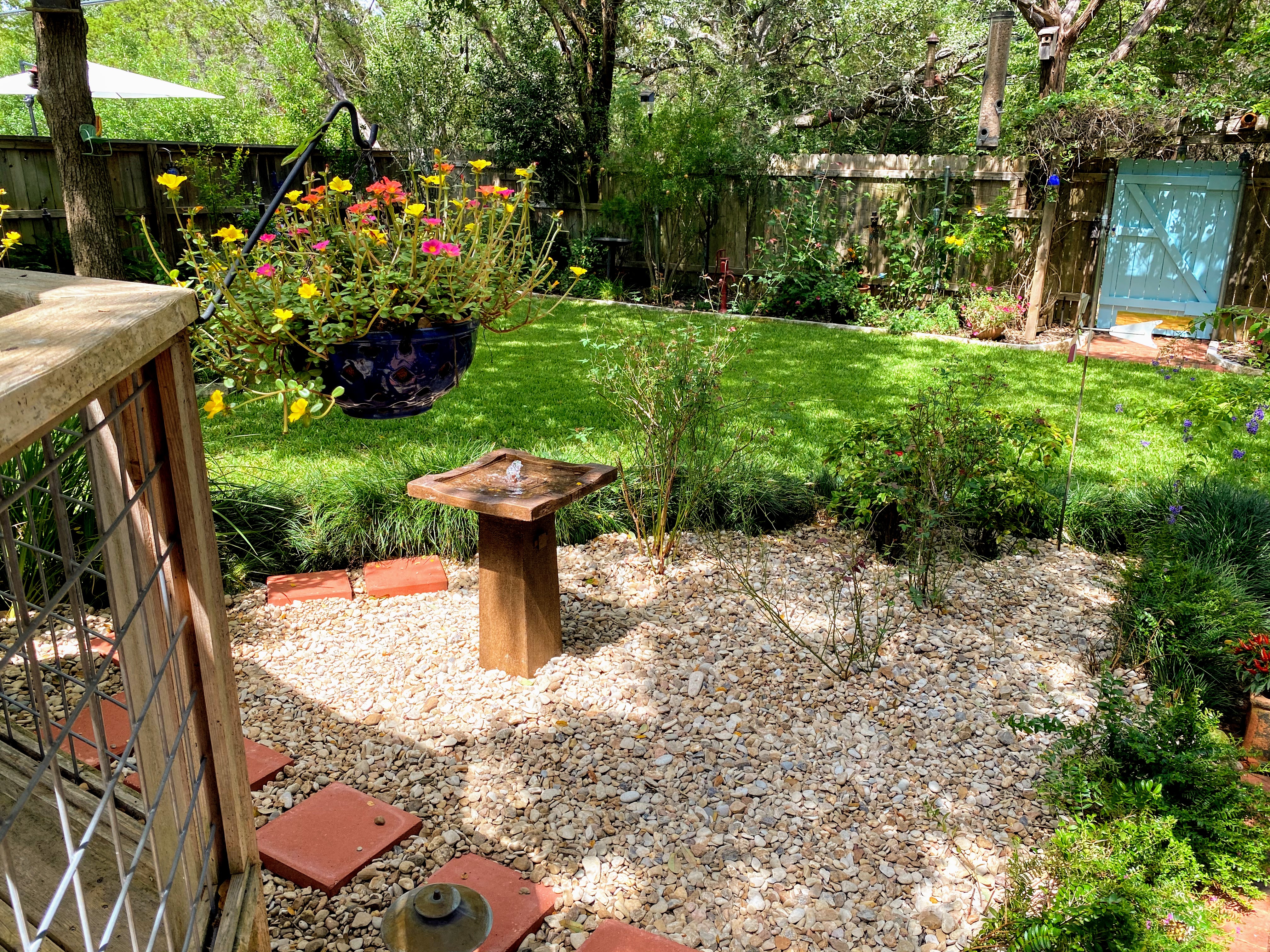 I was just going to mulch it, but as they say, in for a penny, in for a pound, so I decided to take everything out except for the roses, put down river rock, and install a fountain. Eighty bags of rocks, 10 brick pavers, and a 200 lb. fountain later, this is the end product. I’m pretty pleased.